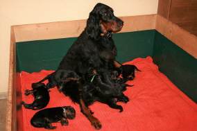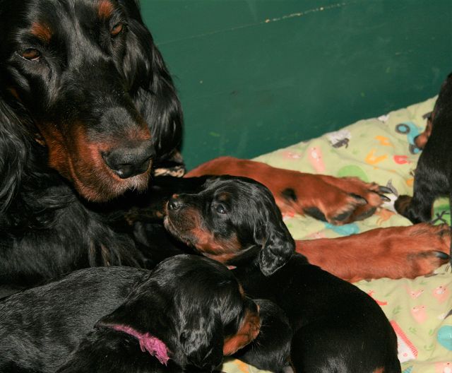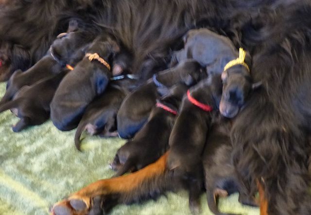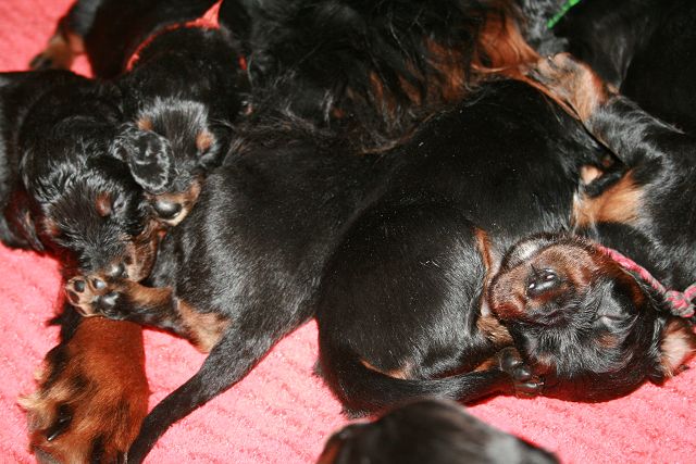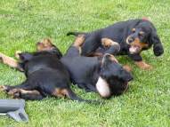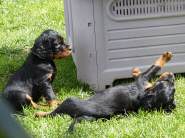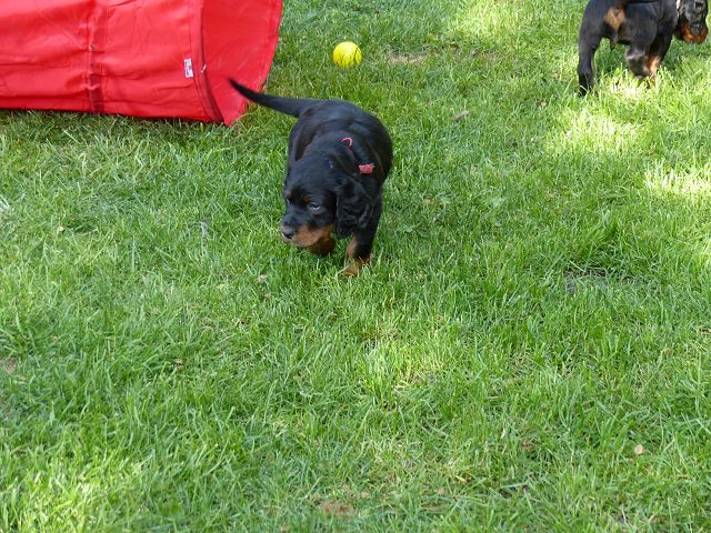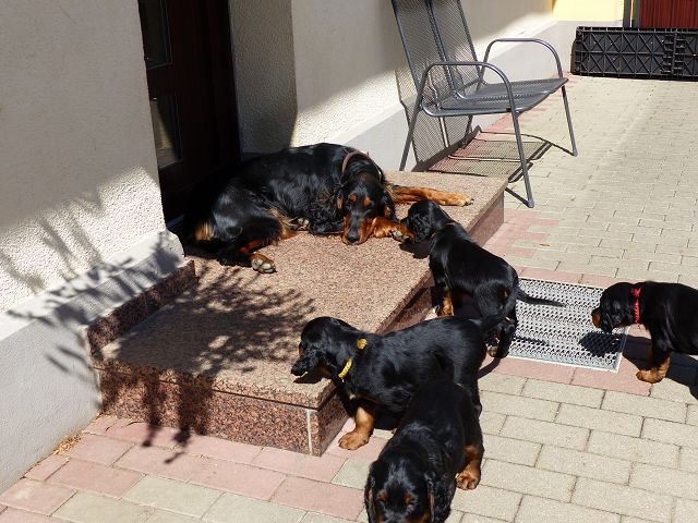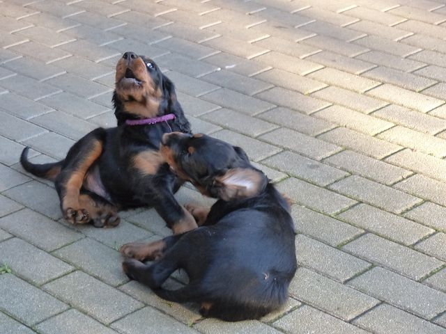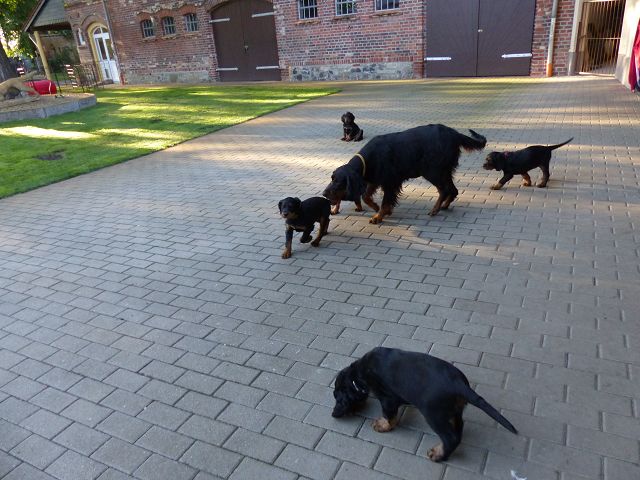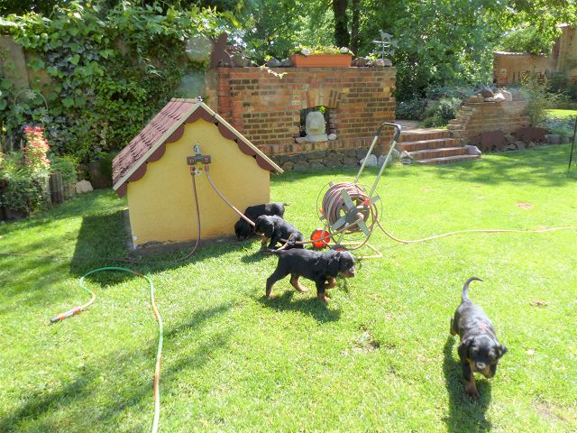 etzt geht es hier ganz schön ab.... Einige zeigen sich sehr interessiert an Gartengeräten, andere mehr am Umterwerfen der Geschwister, Hundger haben sie alle (manche mehr, andere sind schon jetzt mäkelig :-), Lotte spielt ab und zu auch mit den Kindern.... Einige Eindrücke, bevor es bald ernst wird... Am Wochenende kommt erst die Tierärztin, dann der Zuchtwart.... Und dann ziehen die Woche darauf die ersten aus.... Einerseits blutet mir ganz doll das Herz, andererseits merke ich jeden Tag mehr, dass die Kleinen immer mehr Beschäftigung benötigen und ihre eigenen Menschen benötigen.... Und auch wenn die Jungs ausgezogen sind, wird es hier sicherlich mit den beiden kleinen Damen (Domina Olga und Entdeckerin Ophelia) nicht langweilig werden...