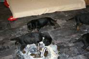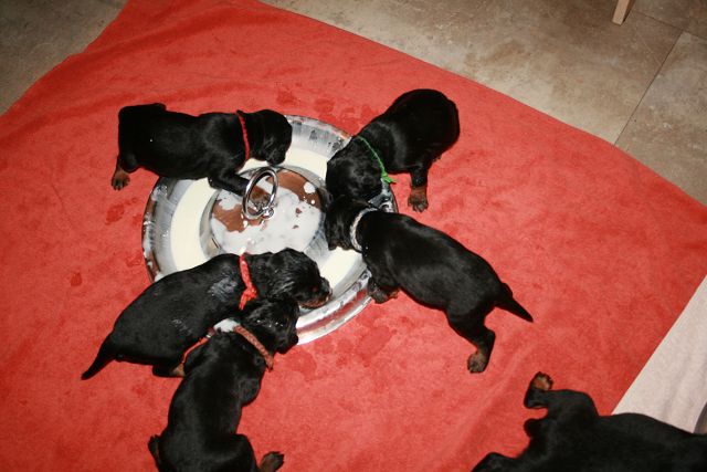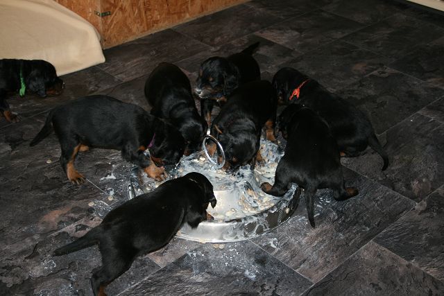 Auch im Welpenauslauf im Jagdzimmer sind die 10 Zwerge schon heimisch - die Essmanieren sind allerdings auch dort nicht besser... |
