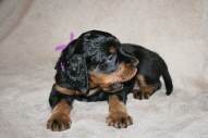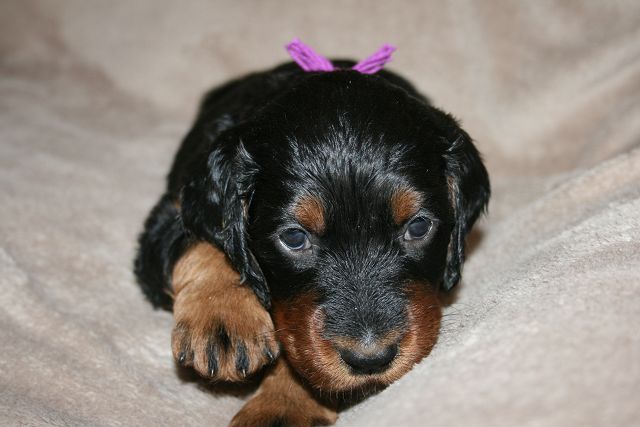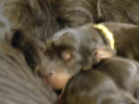 O-Rüde lila (Orell) - der erste der die 4 kg Marke mit gerade 5 Wochen geknackt hat - schläft besonders tief, ist besonders gern und kämpft am liebsten mit den Schwestern :-) |