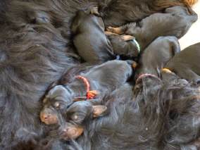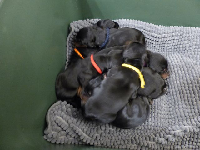26.04.2020 Die O-Kimder sind nun 2 Wochen alt, haben sehr große Entwicklungsschritte gemacht, haben die Augen geöffnet und versuchen schon Mama Lotte und Ziehmama Ida das Futter aus dem Napf zu klauen. Die 10 Zwerge werden sehr umsorgt, manchmal liegen Ida und Lotte beide in der Wurfkiste :-). Lotte geht es recht gut, sie kümmert sich liebevoll um ihre Kinder, geniesst auch schon wieder Spaziergänge