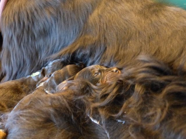 05.05.2020: Die O-Kinder wachsen und gedeihen - Kuscheln steht hoch im Kurs, sie beginnen zu spielen und trinken nun ihre Beikost aus dem Welpenring. Lotte geht wieder mit Begeisterung spazieren, braucht kleine Auszeiten von ihren Kindern...
