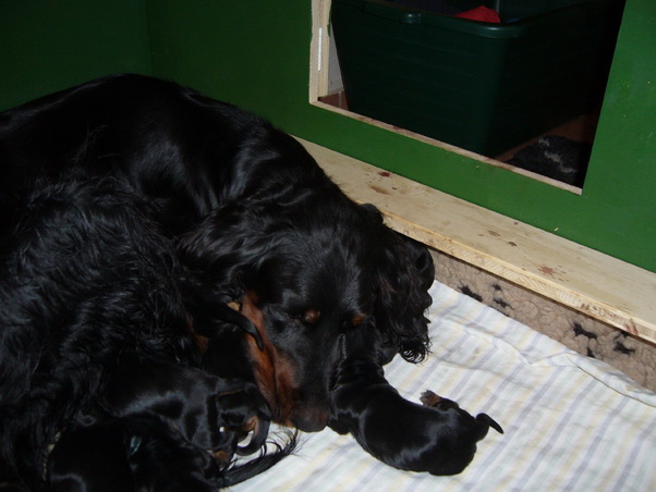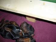 Tag 1 - eine erschöpfte Mutter und 12 Wonneproppen - die Geburtsgewichte der am 12.12.2007 zur Welt gekommenen Zwerge liegt zwischen 460 und 620 g. Vanda erweist sich als instinktsichere Mutter. Hagen wacht vor der Wurfkiste und besucht zwischendurch seine Vanda... |