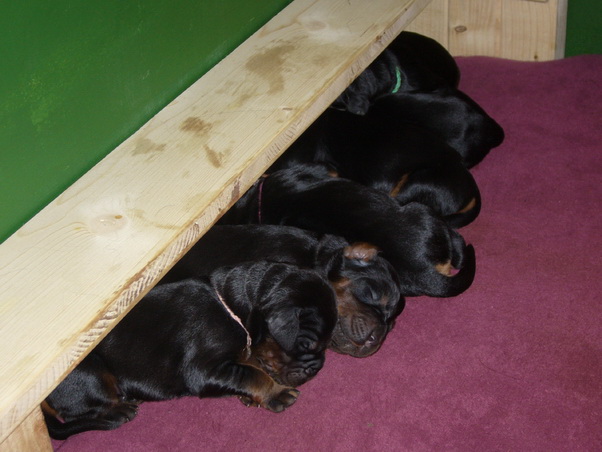 Tag 35: Gaaanz viel Besuch gibt es jetzt immer an den Wochenenden... Und natürlich ist auch sonst eine Menge los in der Wurfkiste oder im Welpenhaus, auch wenn die Kleinen doch die meiste Zeit des tages noch schafen... |