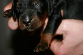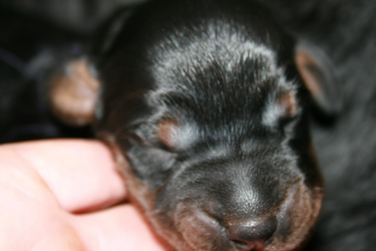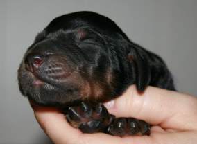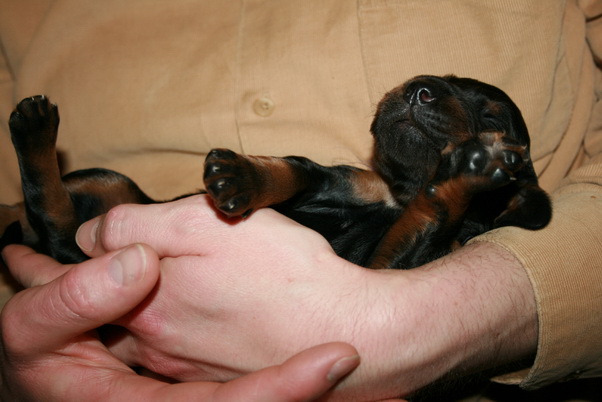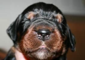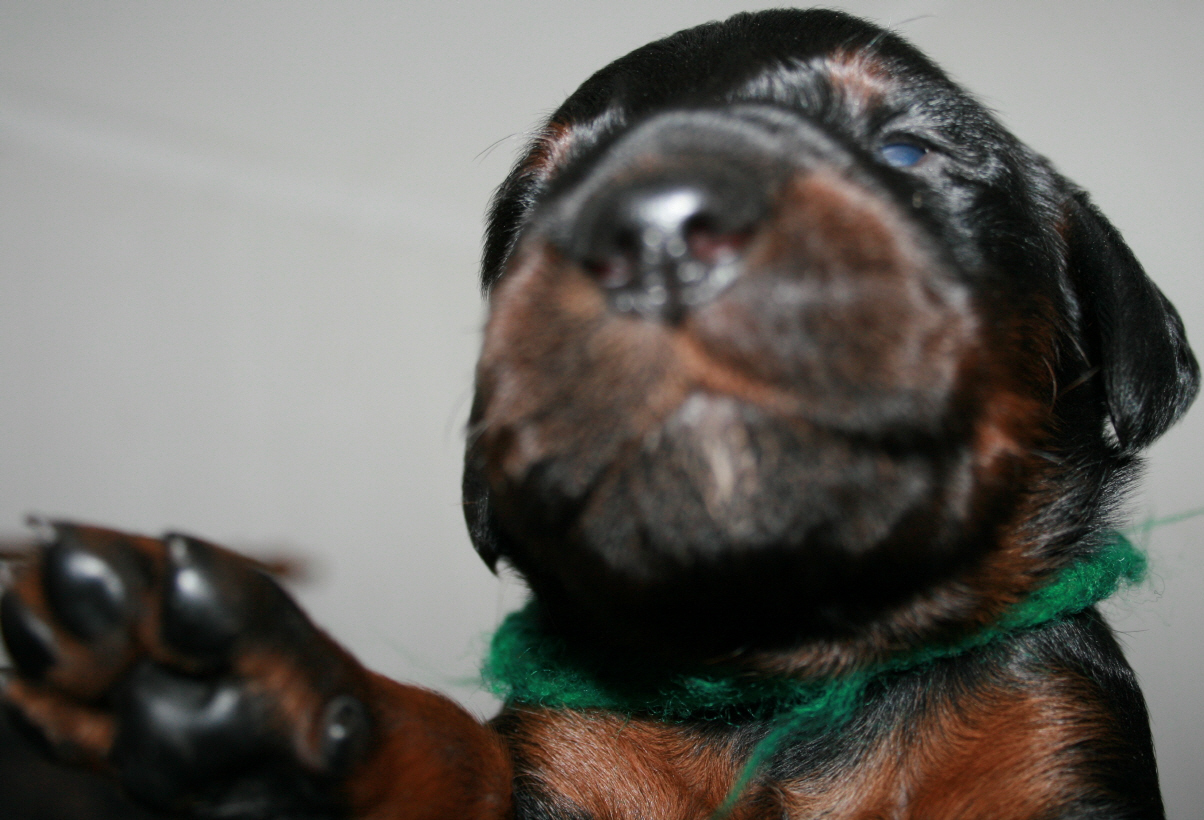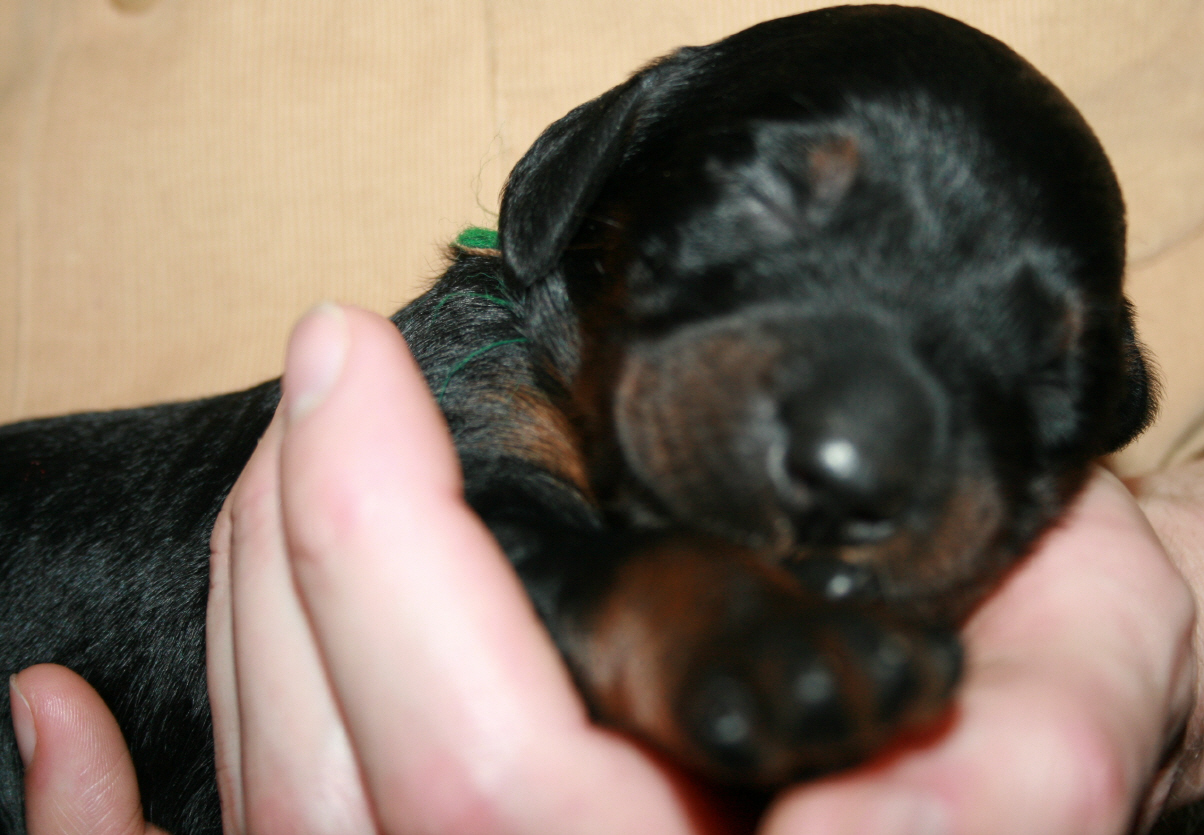 Hey! Ich bin der Rüde mit dem grünen Halsbändchen! Ich bin ein aufgeweckter und neugieriger kleiner Kerl und habe schon eine gewaltige Stimme, wenn mir mal etwas nicht paßt... Zum Beispiel wenn ich aus der Wurfkiste rausgeklettert bin und meine Mama oder meine Tanten sich nicht sofort wieder um mich kümmern... Ich habe im übrigen einen sehr dunklen und intensiven Brand und werde sicherlich mal ein hübscher Junge... |