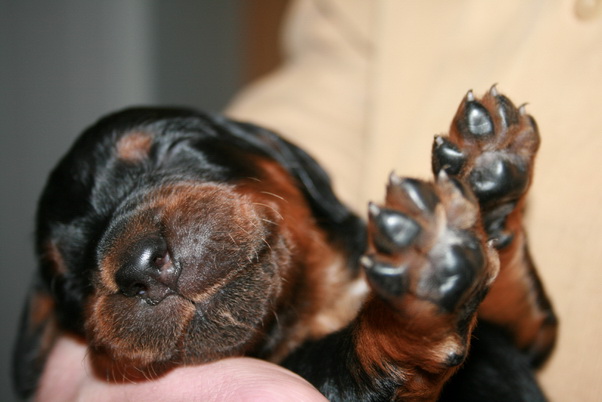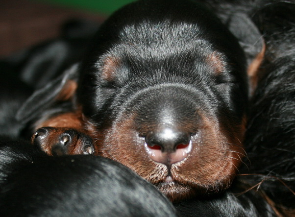 Hi! Ich bin der Rüde mit dem blau-gelben Halsband - ich schlafe viel, egal wo, bin ein ruhiger Schmuser und jetzt der Dickste von meinen Geschwistern - ich habe schon fast 3200g... Ich werde sicherlich einmal ein kräftiger und großer und auch sehr typvoller Gordon-Rüde... |