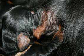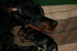Hey! Ich bin Mr. Coolman der dicke Gordonsetterknabe - der Junge mit dem schwarz-lilanen Halsband!Ich bin der kräftigste und dominateste aus dem Wurf, bin natürlich auch zu meinen Geschwistern nett und freundlich - außer wenn es um die Zitze geht. Besonders gerne nehme ich meine kleine Schwester (die mit dem rosa-weißen Halsbändchen, die halbe Portion) als Kopfkissen... Aber keine Angst - ich werde ein gaaanz Lieber (und auch sehr Hübscher)!!! |