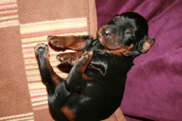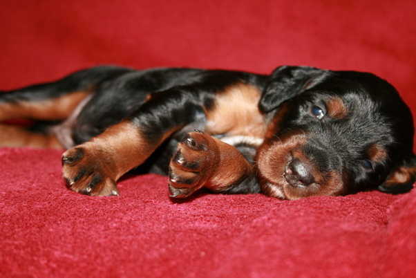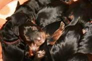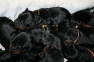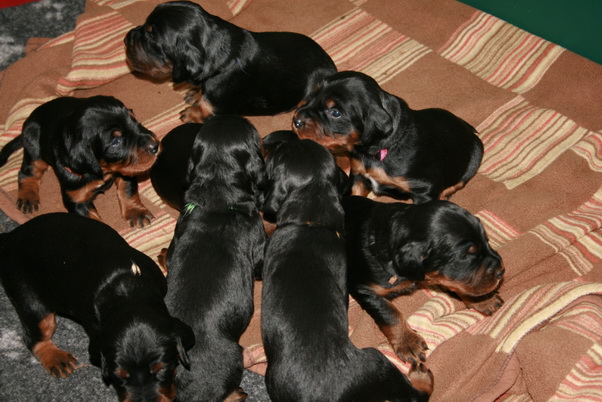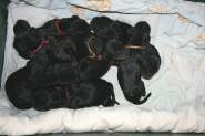 03.10.2011: Nun sind wir 8 1/2 Wochen alt und die ersten beiden haben uns verlassen!!! Aber davor ist ja auch sooo viel passiert. Als erstes kam ein Arzt, der war total lieb mit uns, und der hat uns aufgiebig untersucht und dann geimpft und gechipt, wir waren alle sehr tapfer und abends gab es Hühnchenfleisch mit Reis und zum Nachtisch Dörrfleisch. Und dann kam am 1. Oktober der Zuchtwart, ein großer Mensch mit großen Händen, der uns auch total ausgiebig untersucht hat und sehr zufrieden mit uns war, wir sind ohne jeden Mangel durch die "Endkontrolle" gegangen, der hat uns dann auch tätowiert (auch dabei waren die meisten sehr tapfer). Auf jedem Fall haben wir nach wenigen Miuten wieder Gas gegeben, als hätte uns nie was gepiekt. Und: Eva will uns keinen neuen Welpentunnel geben, nur weil wir für den jetzigen nur eine Viertel Stunde gebraucht haben... Und sie hat so etwas gesagt wie "gräßliche, kleine Tiere" - uns kann sie damit ja wohl nicht gemeint haben, oder??? Wir sind ja nur zauberhaft :-) Hier ein paar Fotos von unserer Schandtat, unserm Spiel und Schlaf und den Auszügen: