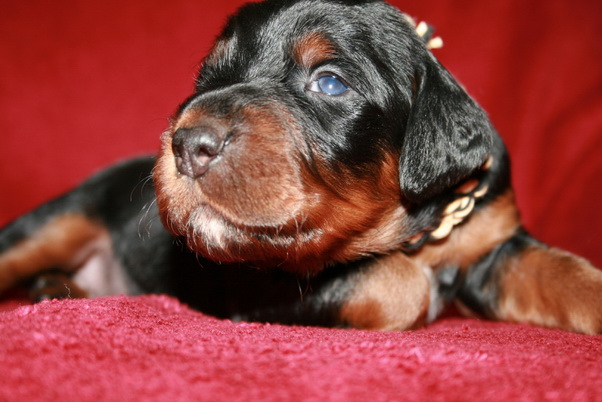 Ich trage das braune Halsbändchen und bin ein wunderschöner Bube mit einem ausgeprägten Stop und jetzt schon besonders kräftigem Fell - ich bin sehr neugierig... |