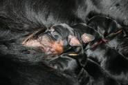 06.08.2011: 3 Tage sind wir heute schon!!! Unsere Mama ist nur lieb und kümmert sich sehr fürsorglich um uns. 9 von uns haben sehr gut zugnommen. Mama Aby saust nur raus, um ihre Geschäfte zu erledigen, dann will sie schnell wieder zu uns - mal schauen, wie lange noch... Leider ist am 05.08.2011 um 23:55 Uhr ein Mädchen gestorben - sie war die zuletzt Geborene und ihr Tod wäre mit einer richtigen Untersuchung mit einer richtigen Diagnose zu vermeiden gewesen. Nachdem ihre 9 Geschwister zur Welt gekommen waren hatte Aby noch sehr deutliche Wehen. Ich konnte keinen Welpen mehr tasten und war unsicher, ob es noch Presswehen waren oder sehr starke Nachwehen. Dementsprechend rief ich den Vertretungsarzt meines Tierarztes an, der gerade im Urlaub ist, und bat diesen nachzuschauen, ob "Aby leer sei". Er kam mit einem mobilen Ultraschallgerät und diagnostizierte, dass definitiv kein Welpe mehr in der Hündin wäre, dementsprechend stimmte ich zu, ihr kein Oxitozyn zu spritzen (Wehenmittel). Über 8 Stunden nach dem zuletzt geborenen Welpen, kam dann plötzlich das Mädchen, das mit dem beigen Halsband gekennzeichnet wurde, zur Welt. Sie hatte von allen Mädels das stärkste Geburtsgewicht, jedoch muß sie stundenlang im Geburtskanal gesteckt haben, das Fruchtwasser war sehr dunkel und sie zeigte fast keine Vitalfunktionen. Ich versorgte sie so schnell es geht mit Doxapram, kalten Güssen und Wechselbädern, immer wieder rubbelte ich sie kräftig mit einem Handtuch, damit die Vitalfunktionen geweckt wurden und kämpfte mit den Mengen an Fruchtwasser, die der Kleinen aus der Nase kamen, immer wieder... Nachdem der Kreiskauf erst einmal da war, fuhr ich mit ihr und Aby zu einer kleinen Klinik, in der sie zusätzlich etwas stabilisiert wurde und bei der ich Aby per Ultraschall und Röntgen untersuchen ließ, um sicherzugehen, dass definitv kein Welpe mehr in ihr war - denn das ist schließlich nicht nur für den Welpen ggf. gefährlich (wie ich jetzt erstmalig miterleben mußte), sondern auch für die Mutterhündin... Die Kleine hatte das Problem, ihr Körpertemperatur zu regulieren und es kam immer wieder Flüssigkeit, die wie Fruchtwasser roch, aus ihrem Schnäuzchen, Welpenmilch, Glucose und Elektrolyte behielt sie jedoch problemlos im Magen. Letzteres gab mir ebenso etwas Hoffnung wie die Tatsache, dass Aby sie fürsorglich putzte und wärmte. Die Kleine ist in meinen Händen gestorben, während sie auf einem Wärmekissen lag... Sie wird so immer bei uns bleiben... Bei aller Traurigkeit macht es trotzdem Freude, die fidelen Neun in der Wurfkiste zu beobachten und daran sollen alle teilhaben: