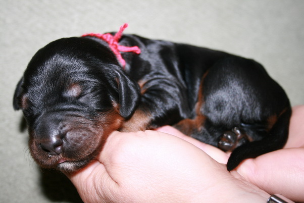 Die Hündin mit dem pinken Halsband - die erste, die di Augen aufmacht und läuft... |