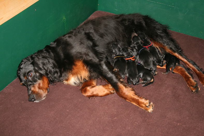 Am 07.07.2013 ist unser L-Wurf zur Welt gekommen: Aby - Scotland Kings Abygail , die über Jahre ihre hervorragenden Leistungen auf Prüfungen und bei der Jagd unter Beweis gestellt hat, ist Mama geworden. Vater ist unser Hagen - Flash vom Pinnower Moor , der sowohl durch Spitzenleistungen wie auch durch Schönheit überzeugt. Beide sind überzeugend und souverän im Umgang mit Menschen und anderen Hunden. So sind die beiden unter anderem auch als Therapiehunde bei schwerst psychisch Kranken im Einsatz und bewirken dort mehr, als Menschen und Medikamente alleine können. Akzuelle Fotos von den 7 Zwergen gibt es unter Welpentagebuch L-Wurf . Mehr Informationen zu den Eltern durch das Anklicken auf die Namen, das wichtigste hier:
