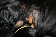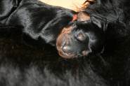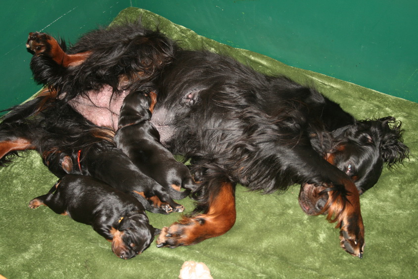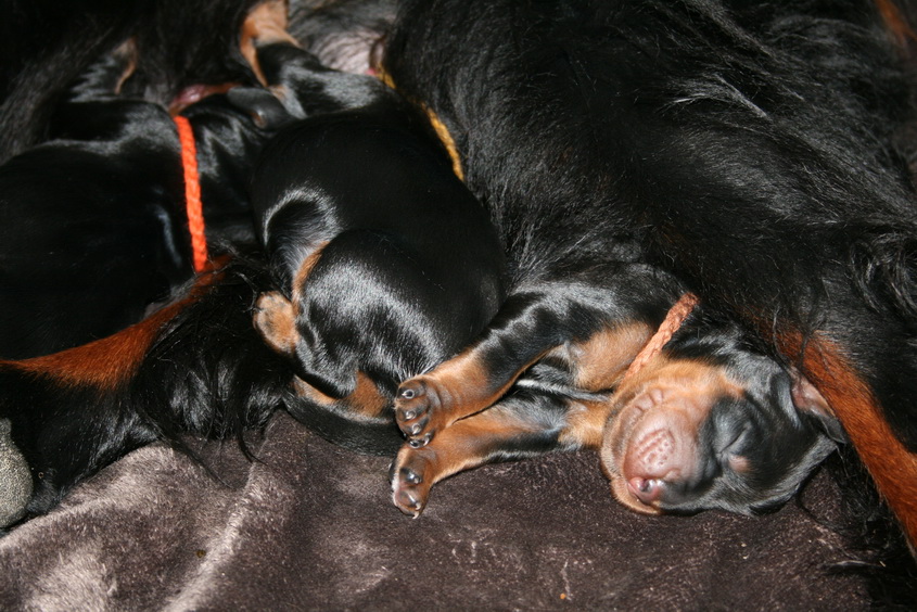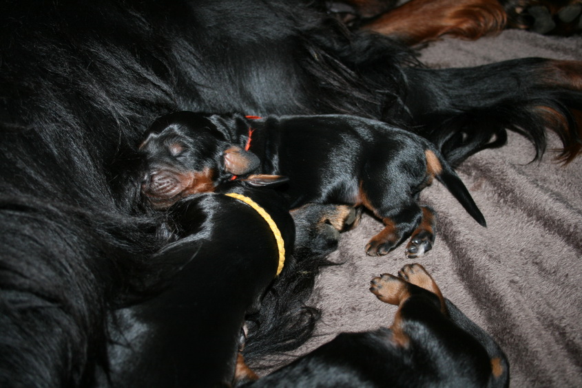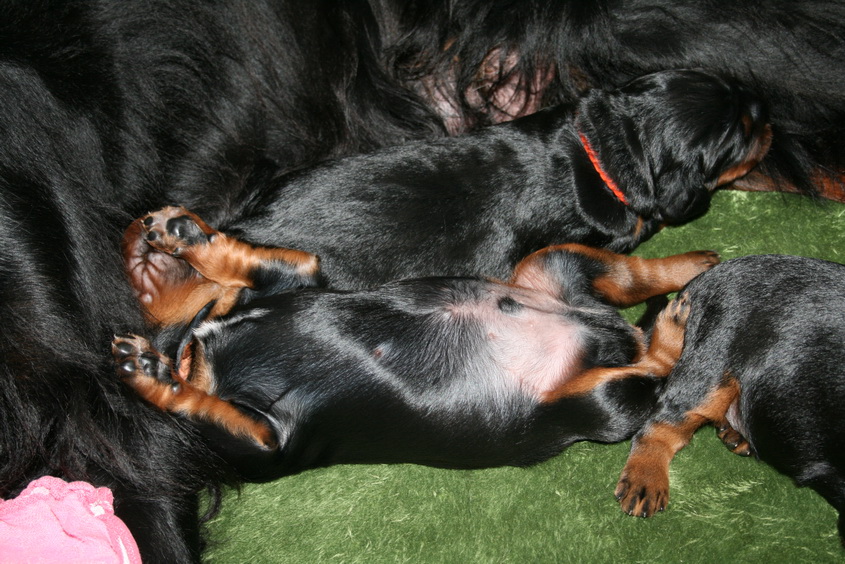 15.03.2016: Fotos von Tag 4 und 5 des zauberhaften Trios. Coleen versteckt die drei zu gerne unter Beinen und Brustkorb und dort fühlen die drei sich auch oft seh wohl - in der warmen Höhle. Coleen geht mittlerweile gerne 15 Minuten spazieren, möchte dann aber nur noch schnell zurück zu ihren Welpen. Hier Fotos von der zufriedenen Familie: