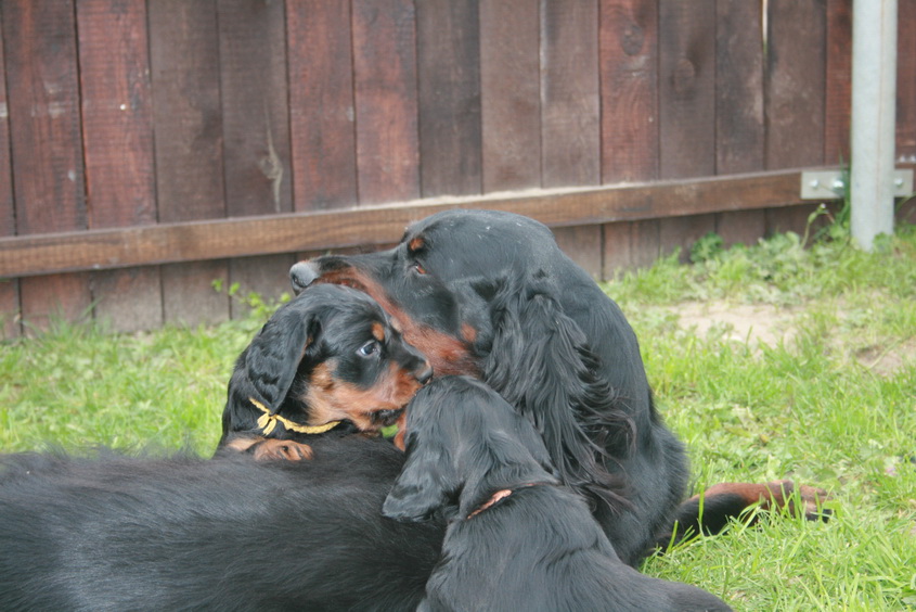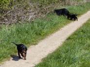 26.04.2016: Die drei Kinder werden nach wie vor von Mama Coleen sehr verwöhnt - Coleen liebt es mit ihnen zu kuscheln und zu spielen und bevorzugt die antiautoritäre Erziehung... Die Kinder nuckeln weiter heftig an ihr und sind entsprechend mäkelig, was "Hundefutter" anbelangt, aber sehr aufgeschlossen, wenn es "Menschenessen gibt" - Käse ist lecker, Gulasch genial... Seit ein paar Tagen kommen die Kleinen ein Mal am Tag mit ins Revier und gehen 20 Minuten mit Spazieren - und sie machen alles ganz tough mit, sehen zu, bei ihren Menschen zu bleiben und entdecken die Welt!