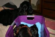 nur eine ist gaaaanz traurig - Merle würde so gerne mit in die Wurfkiste gehen... Aber das erlaubt Coleen nicht... Später, kleine Merle, darfst du ganz bestimmt mit den Kindern spielen... |